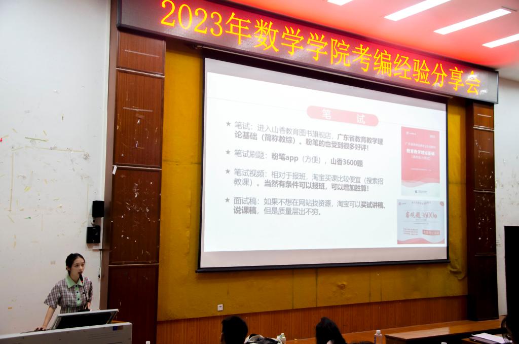 为进一步加强学风建设,帮助同学们了解教师编制考试的内容和形式,提高同学们的就业技能,5月25日晚,我院在田师100阶梯教室组织开展了考编经验分享会。本次分享会邀请了1902班陈嘉琳、1903班李俊杰、1904班黄丹萍、1908班邹小涛等4位2023届毕业生代表作交流分享。辅导员、2020级师范班学生共200余人参加了分享会。此次活动由辅导员房华玲老师主持。