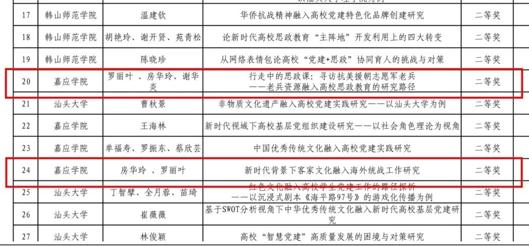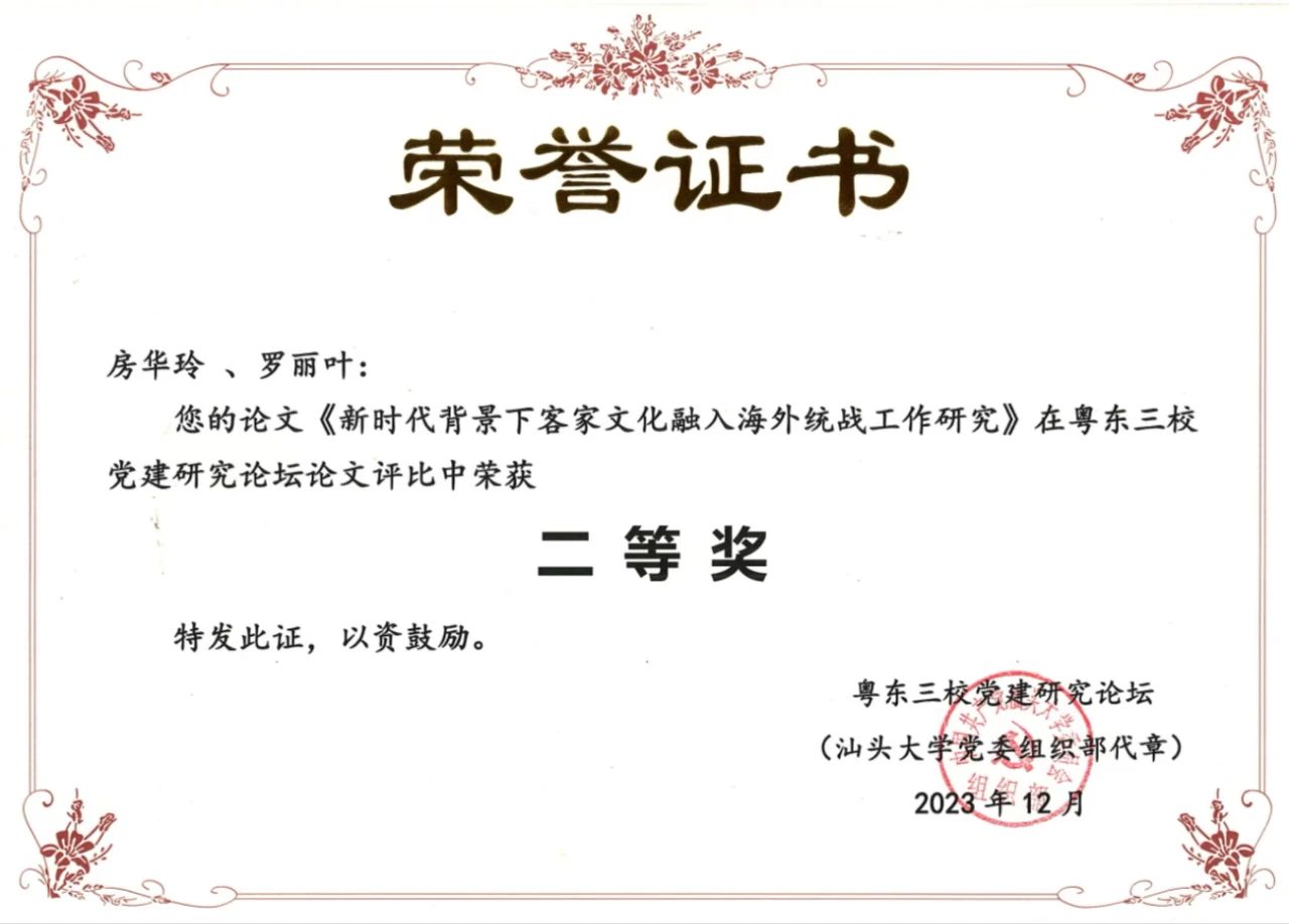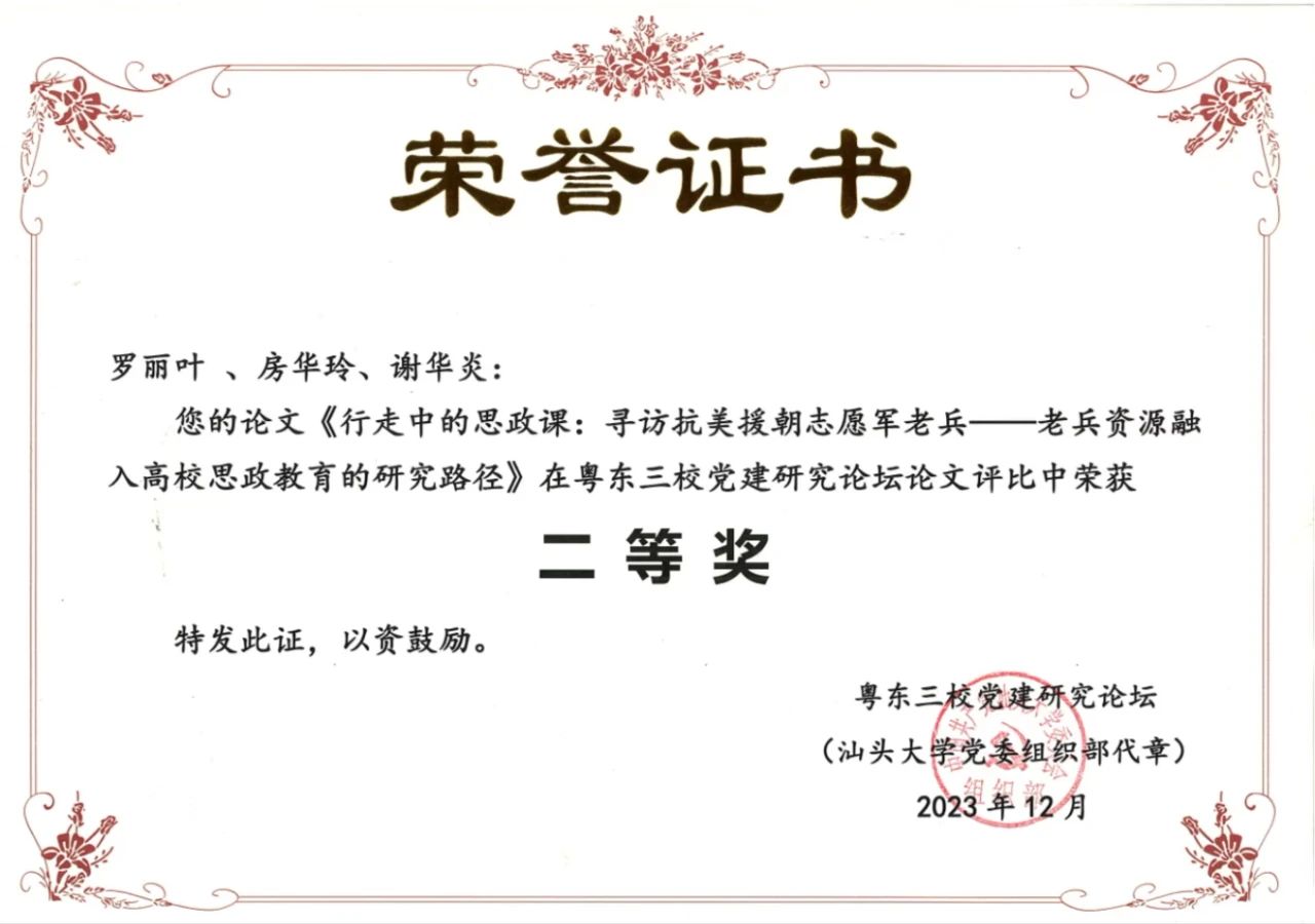 近日,粤东三校党建研究论坛论文评审结果公布,我院提交的作品《行走中的思政课:寻访抗美援朝志愿军老兵--老兵资源融入高校思政教育的研究路径》(论文撰写人:罗丽叶、房华玲、谢华炎)和《新时代背景下客家文化融入海外统战工作研究》(论文撰写人:房华玲、罗丽叶)在粤东三校党建研究论坛论文征集中,荣获二等奖。