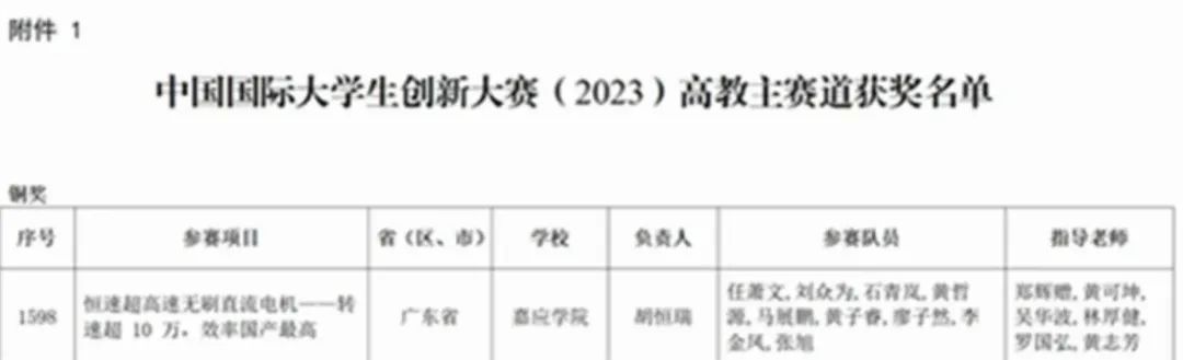 近日,教育部公布中国国际大学生创新大赛(2023)国赛获奖名单,我院学生胡恒瑞等同学的项目《恒速超高速无刷直流电机——转速超10万,效率国产最高》荣获国赛“高教主赛道”铜奖。