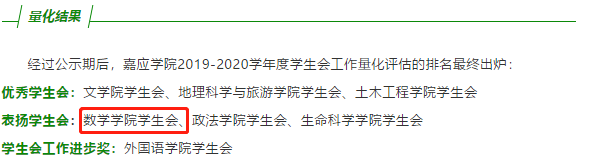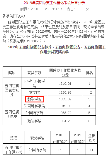 喜报!喜报!数学学院团总支在嘉应学院2019-2020学年度团总支工作量化考核中荣获“五四红旗团总支标兵”称号,数学学院学生会在嘉应学院2019-2020学年度学生会工作量化评估中荣获“表扬学生会”称号。