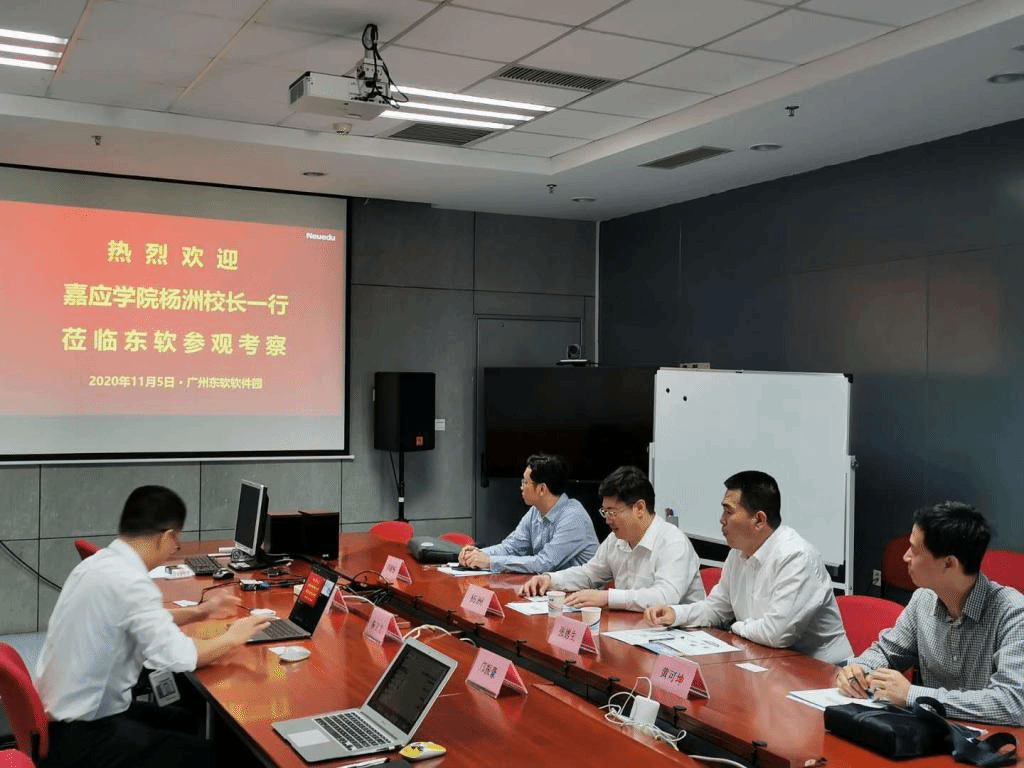 第一间考察的实践教学基地是广州市东软教育科技集团,在参观了一些办公和教学场所之后,东软华南区总经理杨义文介绍了东软教育科技集团和高校合作的主要内容,并和我校达成了联合建立产业学院的意向。