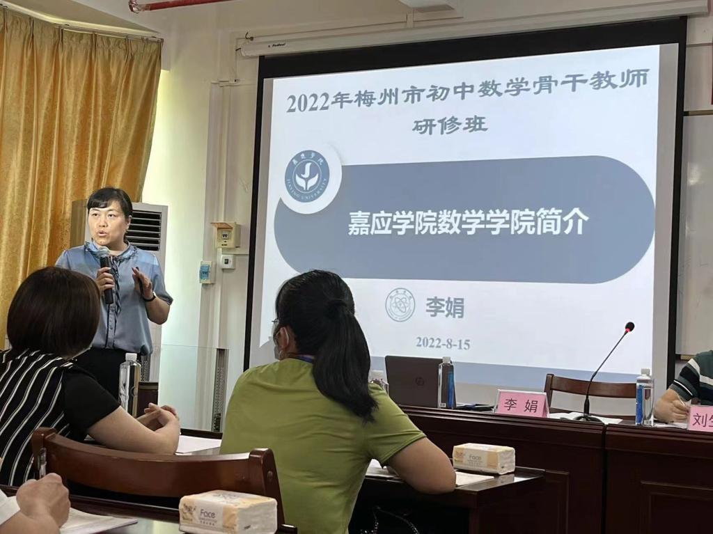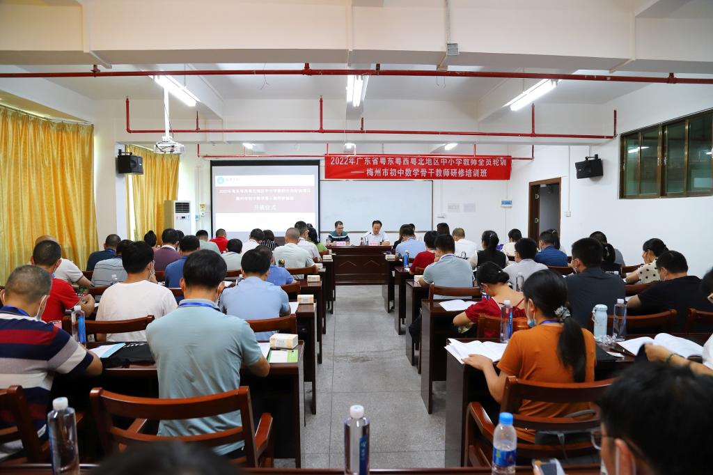 8月15日下午,2022年广东省粤东粤西粤北地区中小学教师全员轮训项目——梅州市普通初中数学骨干教师研修班举行了隆重的开班仪式,仪式由嘉应学院数学学院副院长李娟博士主持。仪式上,省级中小学教师发展中心田守凯副主任、嘉应学院数学学院李娟副院长、培训项目首席专家刘生贵副教授做了讲话,培训班教学班主任、生活班主任以及来自全市七个区县的各中学初中数学学科骨干教师60多人参加了本次活动。