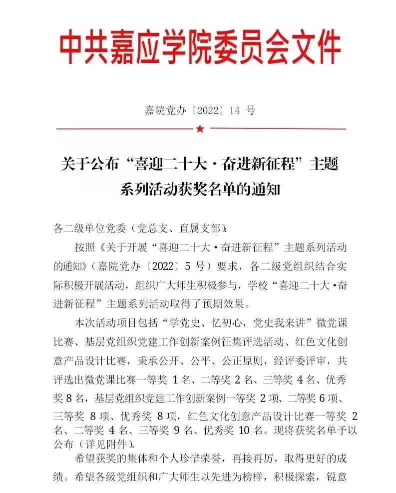 近日,学校公布了“喜迎二十大·奋进新征程”主题系列活动获奖名单。其中,我院学生第二党支部在学校基层党组织党建工作创新案例征集评选活中荣获一等奖;学生张小薇在“学党史、忆初心,党史我来讲”微党课比赛中荣获三等奖。