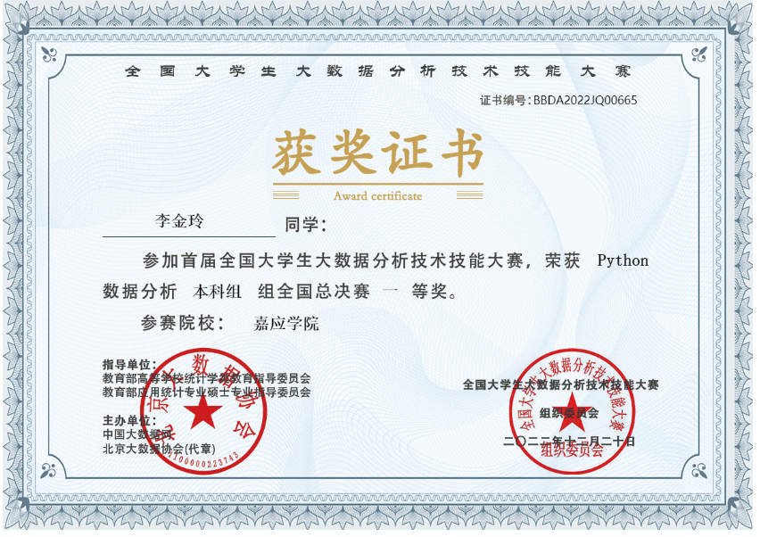全国大学生大数据分析技术技能大赛是由教育部高等学校统计学类教育指导委员会、教育部应用统计专业硕士专业指导委员会指导,由北京大数据协会、中国大数据网主办的全国性专业赛事,分为 Excel 数据分析和 Python 数据分析两个赛项,设省级赛和全国赛。其中,省赛一等奖占参赛总人数的5%;省赛二等奖占10%;省赛三等奖占20%。2022年,来自北京大学、南开大学、复旦大学、中央财经大学等 400多所高校的千余名省级赛一等奖获奖学生集结赛场,争夺全国大学生大数据分析技术技能大赛的全国总决赛奖项。