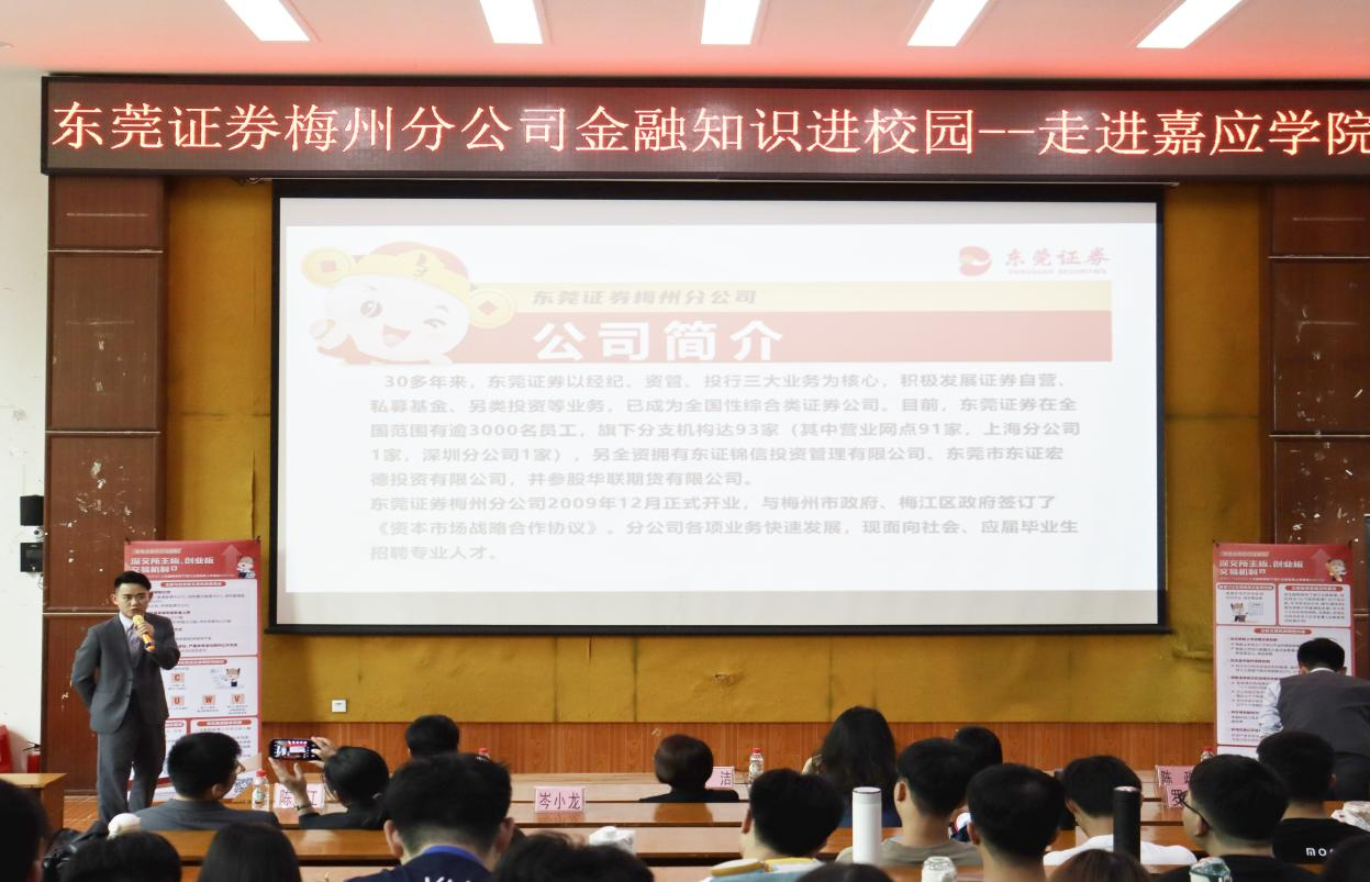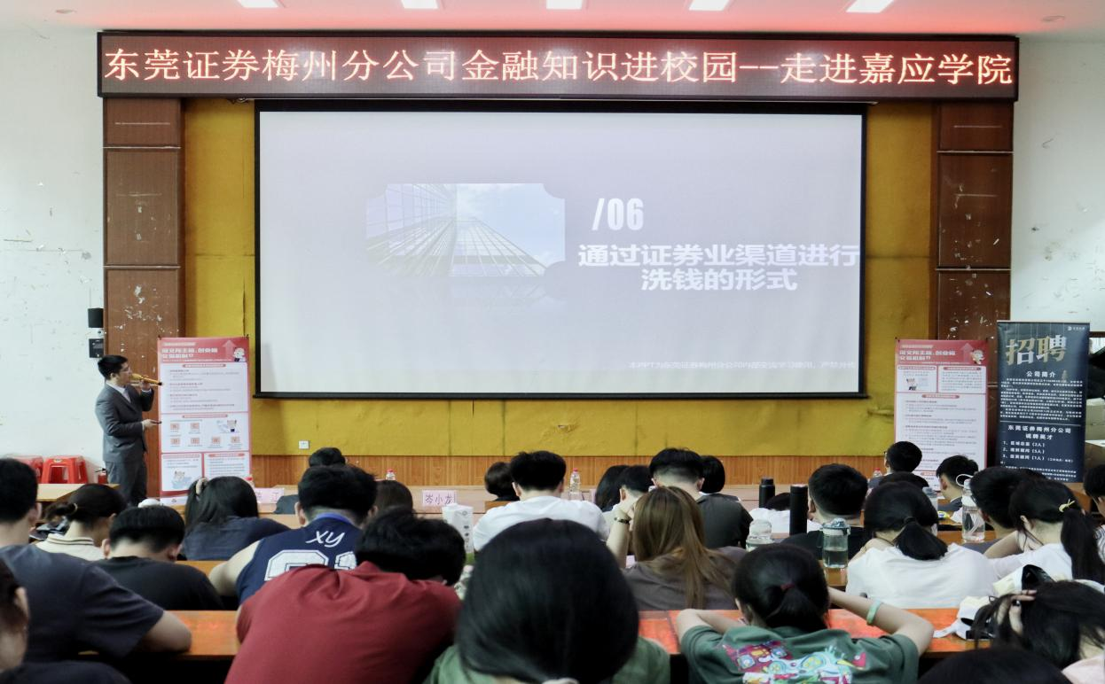 讲座上,东莞证券梅州分公司理财经理罗宏山对公司业务和运营情况进行了介绍,对相应招聘岗位职责要求进行了说明,让同学们对证券行业的发展状况有了初步的认识和了解。投教专员陈江结合典型案例,就非法证券、非法集资、反洗钱的基本特征、常见手段和法律风险等方面进行了详细介绍,提醒同学们要警惕网络宣传、主动防范,在面对以高额利润为诱饵的骗局时应保持理性,树立“安全、文明、理性”的金融观念。