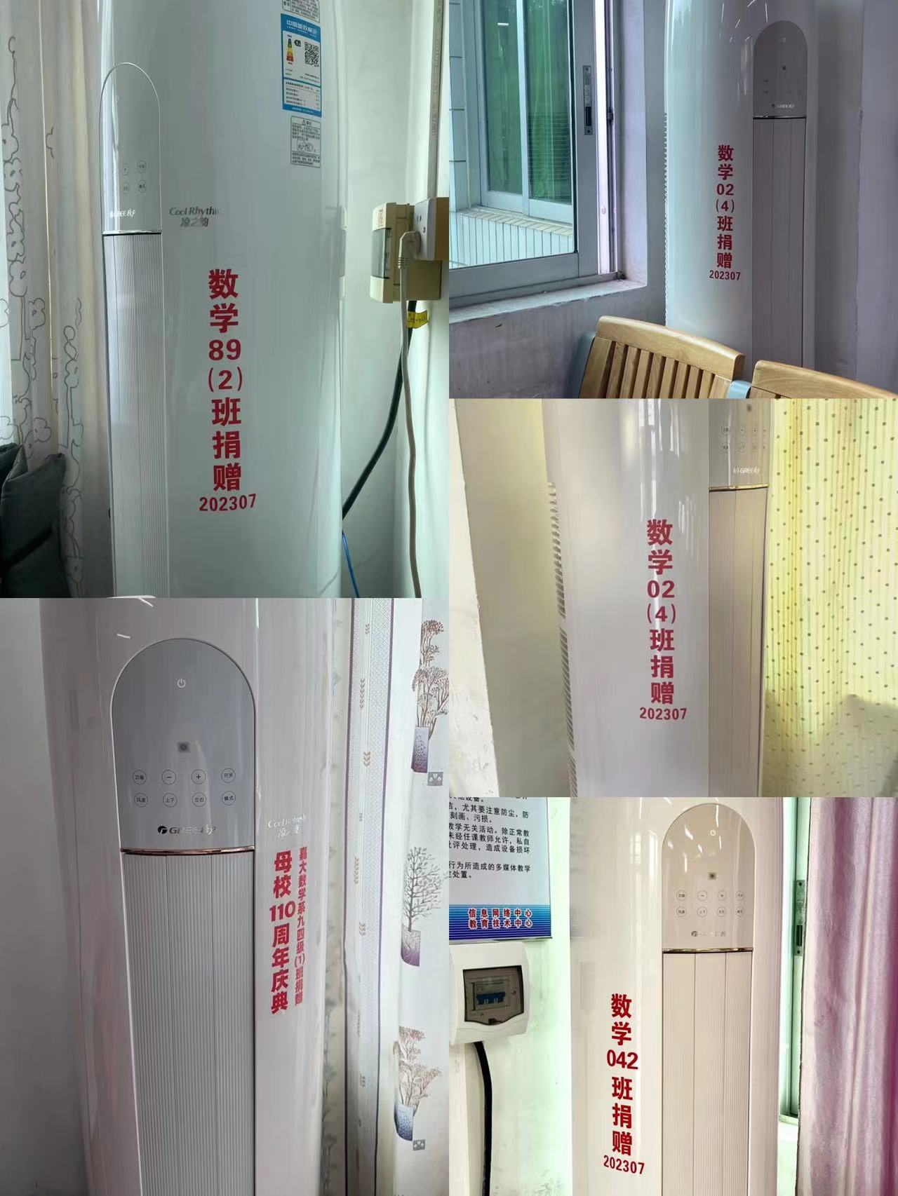 我们一直关注着母校的发展,期待母校更加辉煌!近期我们了解到母校即将举行110周年校庆活动,班委主动与数学学院的领导、班主任杨雯抒老师、王玉霞老师联系,了解学院的发展建设情况。我们都为数学学院的发展壮大感到自豪和欣喜,当我们获悉学院仍有一些教室还像毕业时一样没有配备空调,班委会随即在6月29日倡议同学们捐赠两台3匹空调给学院,尽一点微薄之力。在班委的带动下,同学们积极响应,短短几天就筹措了人民币12186元,并于7月7日快速地把2台空调安装到田师406室,及时地为敬爱的老师、亲爱的师弟师妹们送上“清凉”。