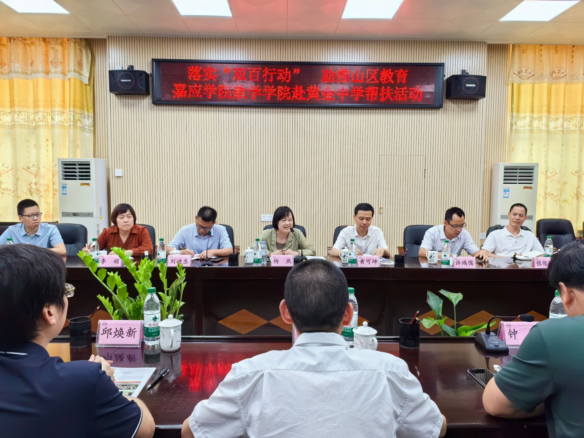 会上,数学学院负责人分别介绍了为推进工作所组建的团队,表示将尽力把中学所需和数院所能相结合,在送教下乡、援教支教、师资培训等方面对黄金中学加大支持力度,提升黄金中学数学教学质量,共绘数学教研新蓝图;同时,也对嘉应学院的基本情况进行了介绍,欢迎黄金中学的学子积极报考。黄金中学负责人对嘉应学院长期以来对该校的关心和帮扶表示感谢,并向工作队介绍了学校的历史和现状,分析了学校发展面临的挑战并提出了数学学科师资培训和专业发展方面的需求。