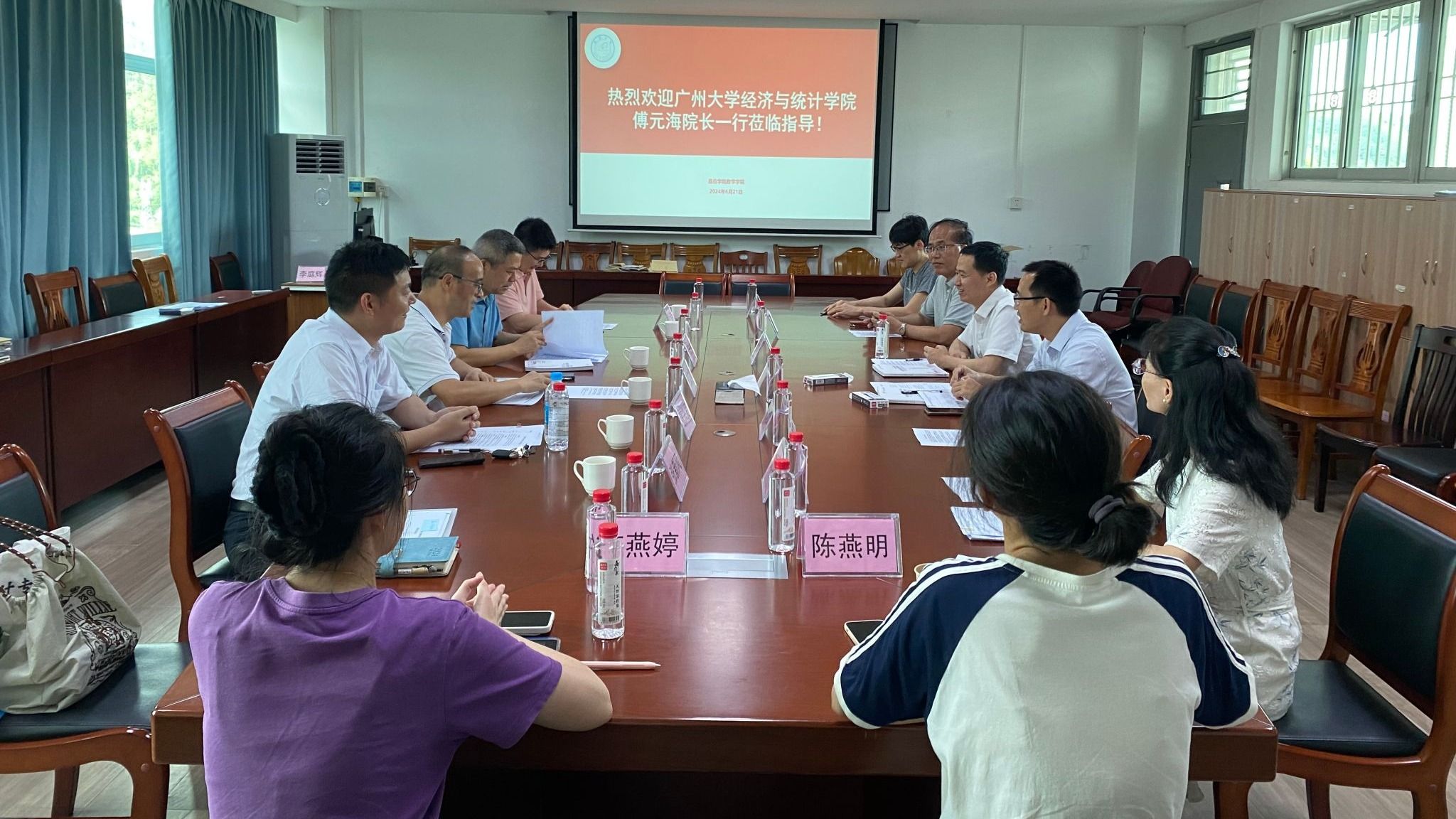 6月21日,我院邀请了广州大学经济与统计学院的院长傅元海教授、副院长李正辉教授、统计系主任张兴发副教授、统计系副主任余玉丰、统计专硕中心秘书张新丰等人前来指导我院应用统计学学科建设暨两院联合培养应用统计学专硕研究生研讨会议。学院院长黄可坤教授、副院长许鸿儒教授、统计专业负责人叶运华教授、统计教研室主任陈燕明,以及统计专业多位教师出席了此次会议。