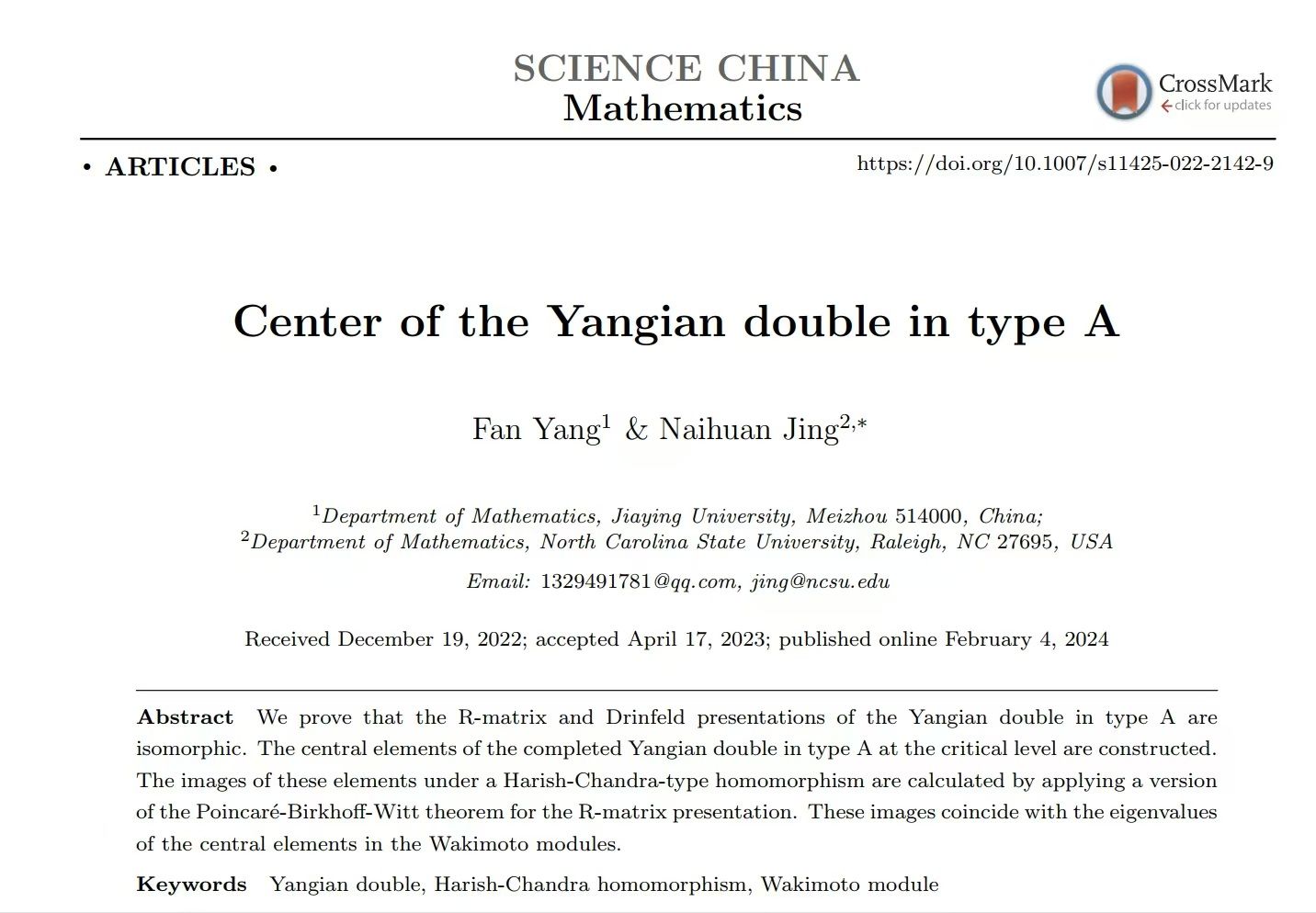 近日,我院教师杨帆博士作为第一作者在中科院1区Top期刊《Science China Mathematics》上发表了题为“Center of the Yangian double in type A”的学术研究论文。