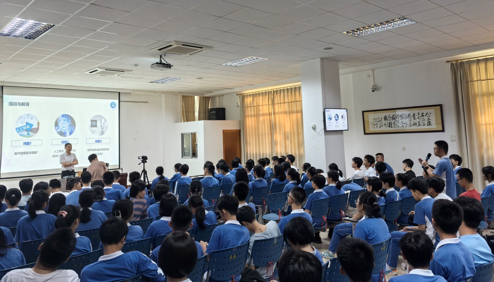 在互动环节,黄教授耐心解答了学生提出的关于人工智能和数学建模的问题。他鼓励学生通过批判性思维重新定义问题,敢于提出假设,并在解决问题的过程中培养团队协作能力。