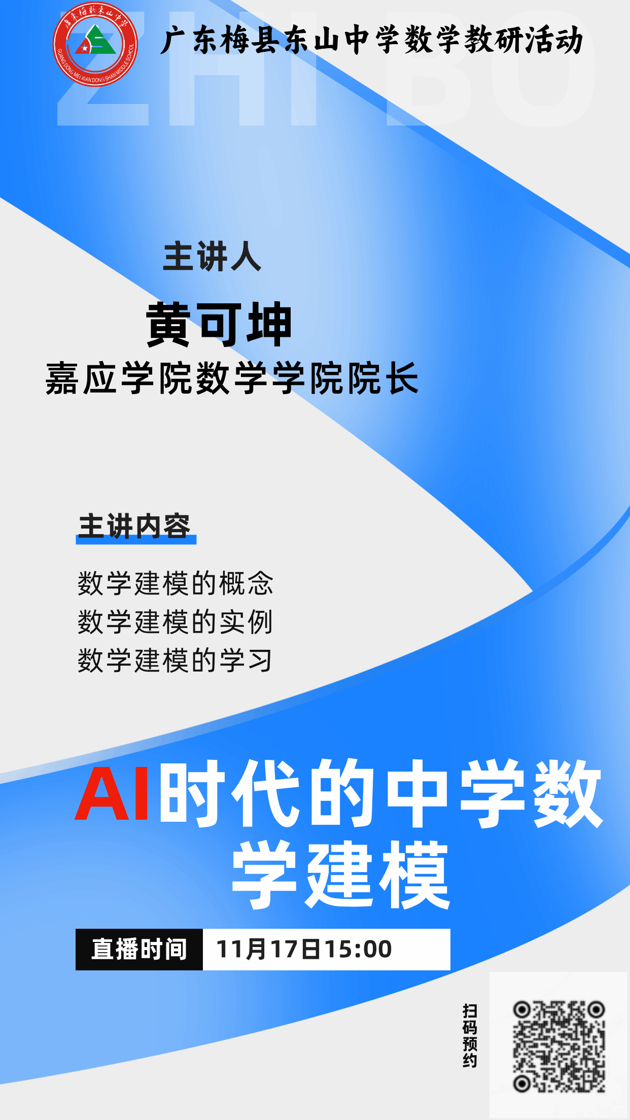 2024年11月17日,应东山中学的邀请,我院数学学院院长黄可坤教授在该校举行了一场题为《人工智能时代的中学数学建模》的专题讲座。这次讲座旨在帮助中学生了解数学建模的基本概念及其在现代科技和生活中的重要应用,同时激发他们的学习兴趣和创新思维。