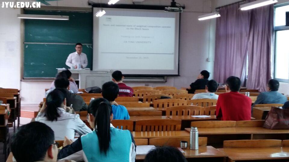 数学学院为交流科研成果,活跃学术氛围,进一步鼓励青年教师开展科研工作,于11月25号下午,在田家炳师范大楼404多媒体教室举办了博士学术报告会。曾玉平、刘小松二位博士分别汇报了他们科研工作的进展、成果及今后的研究方向。本次报告会由院长助理叶运华博士主持,全体专任教师参加了报告会。最后,院长古定桂教授作了总结,要求全体教师不断提高科研能力,在项目申请和学术成果上取得更大的突破,为数学学院学科建设和专业建设作出更大的贡献。