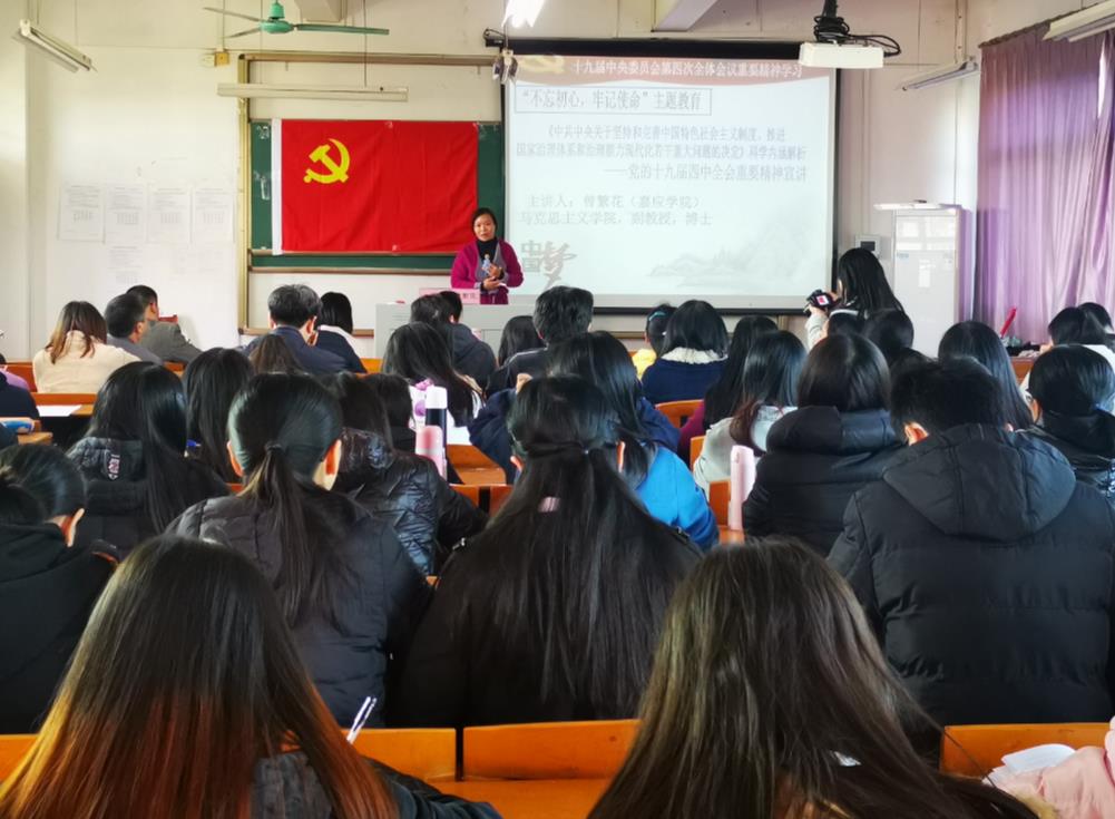 为深入学习宣传贯彻党的十九届四中全会精神,根据《中共嘉应学院委员会关于组织开展党的十九届四中全会精神宣讲活动的通知》文件精神,12月6日下午,数学学院邀请学校宣讲团成员、马克思主义学院曾繁花副教授作专题报告会。学院党总支、教工党支部、学生党支部委员,教职工党员、学生党员和入党积极分子等100多人参加了本次报告会。
