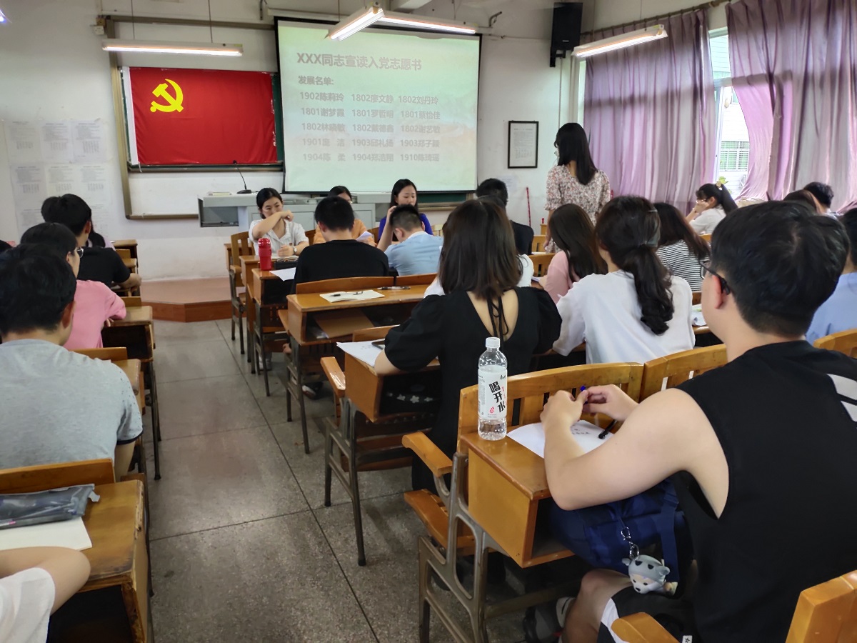 学生第二党支部由支部书记罗丽叶主持,学生党员应到40名,实到35名,会议讨论了何澄婷等15名同志的入党问题,采用无记名投票方式进行表决,大家一致同意吸收何澄婷等15名同志为中共预备党员。