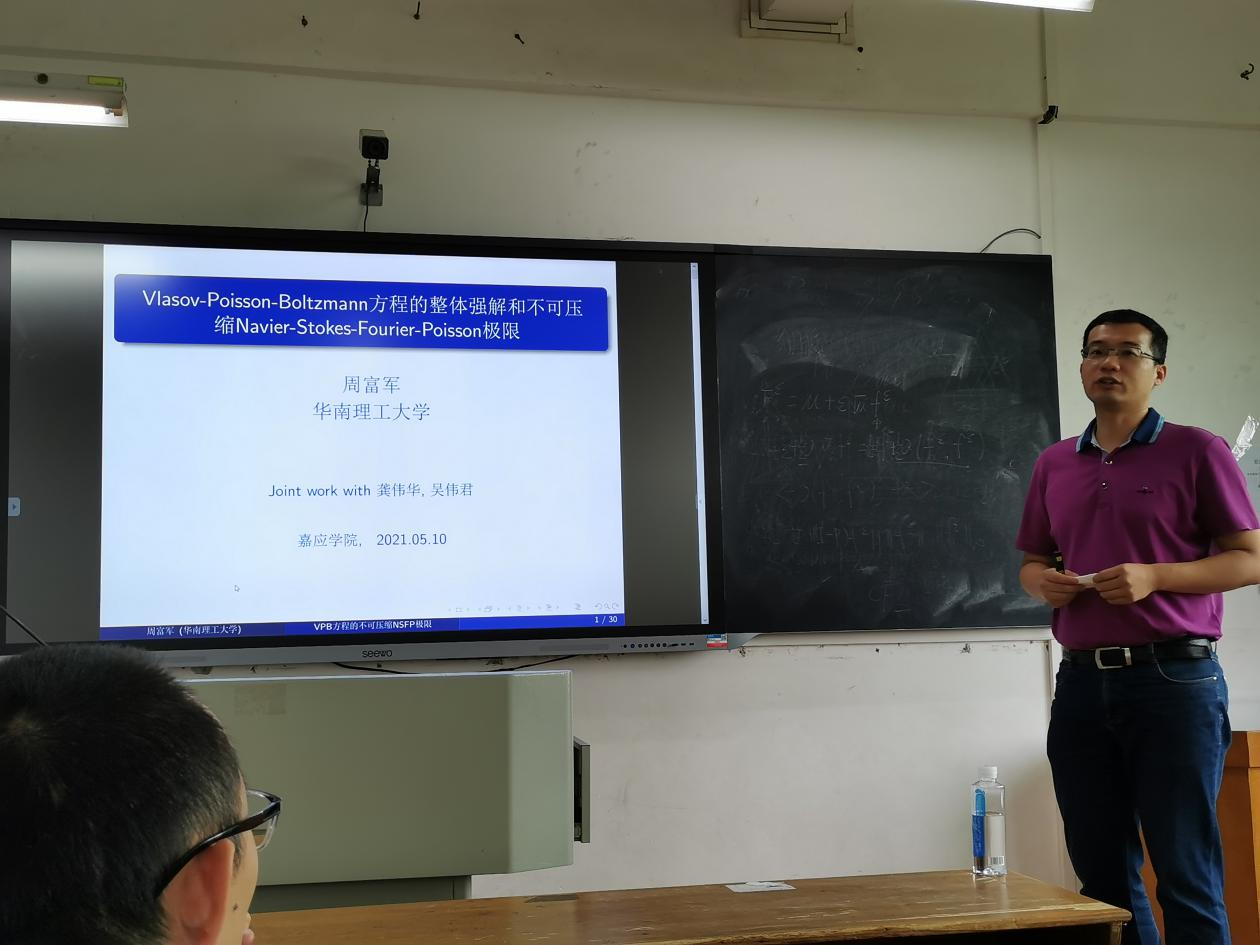 接着周富军教授作了《Vlasov-Poisson-Boltzmann方程的整体强解和不可压缩Navier-Stokes-Fourier-Poission极限》的主题讲座。他主要介绍了方程的物理背景、前沿工作、本人的主要成果以及公开问题。Vlasov-Poisson-Boltzmann方程是描述带电情形下稀薄气体的动力学模型,在Hilbert展开下可以推导出经典的带电流体模型。周教授通过能量估计从数学上证明了Vlasov-Poisson-Boltzmann方程的整体强解存在唯一性,并且得到了衰减率。通过一系列的估计他也从数学上证明了Vlasov-Poisson-Boltzmann方程到不可压缩Navier-Stokes-Fourier-Poission的极限过程。周富军教授和吴伟君博士的成果表明了统计力学和经典力学之间是密切相关的。