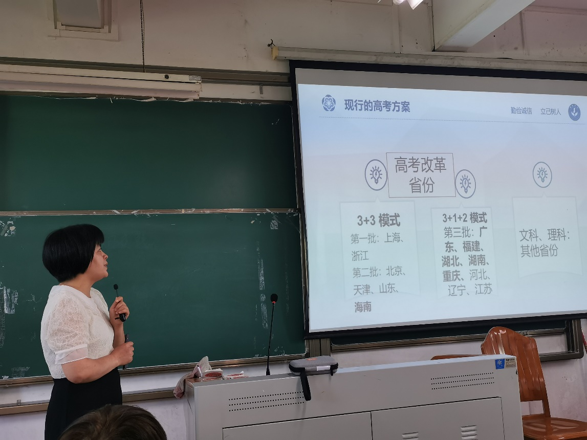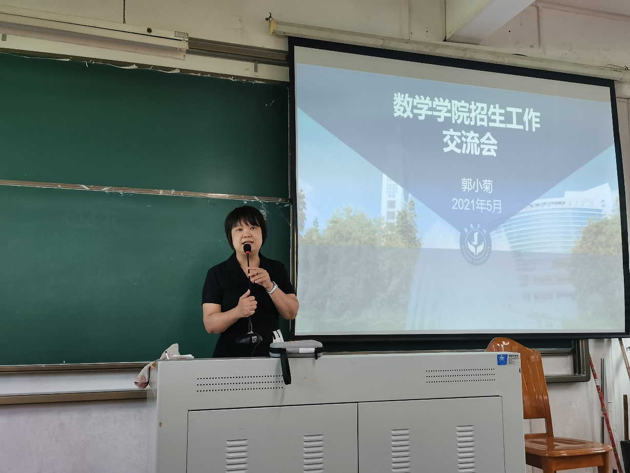 会议邀请到了学校教务处副处长郭小菊老师为我院教师介绍今年我校招生即将面临的形势及需要开展的工作。郭处长首先介绍了现行广东省高考改革方案。即,从今年开始,广东省高考考试科目将采取“3+1+2”的模式,录取实行院校专业组投档模式——每位学生普通类本科院校(含地方专项计划、少数民族班、各类预科班)设45个平行志愿,艺体类本科院校统考设20个平行志愿。接着,郭处长以数学学院3个专业为例,详细讲解了改革对于今年招生的影响,广东新高考首年,考生、家长暂无往年数据可参考,招生宣传工作显得尤为重要等。最后,她给了一些招生宣传的建议, 如学院可根据自己的特色和亮点制作微信推文,加入图片、视频等素材更有利于吸引考生及家长阅读;招生宣传要做好到入人脑、入人心,对于考生不熟识的专业要把专业和生活对接起来,使考生对专业更加了解等。