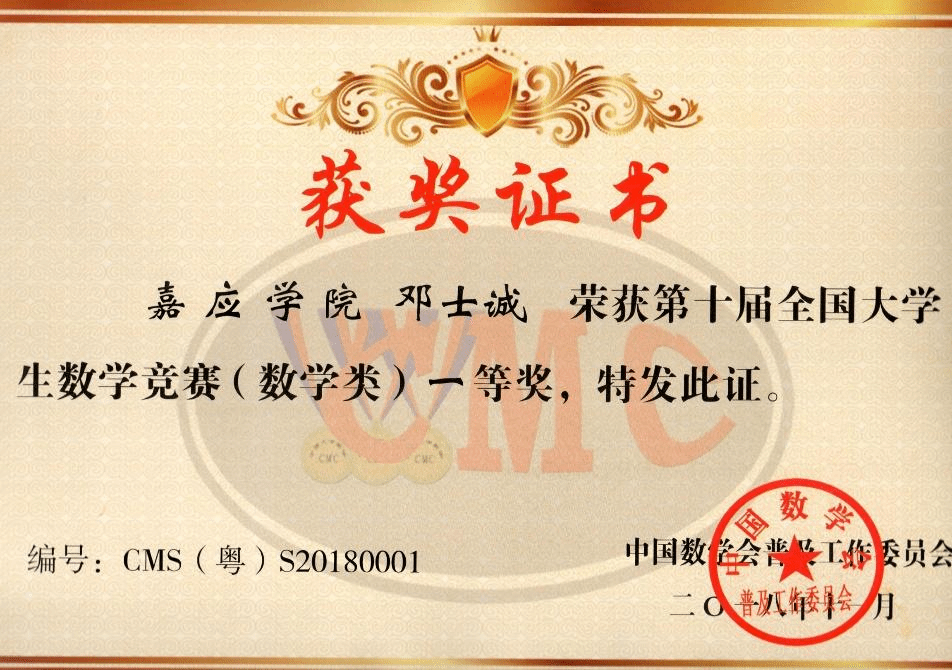 我院邓士诚同学以数学专业类广东赛区第一名的优异成绩参加全国数学竞赛总决赛